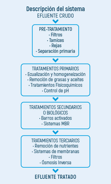 Diseño y proyectos  |  Caracterización de efluentes  Optimización de sistemas  |  Asesoramiento técnico Sistemas de reutilización de efluentes  |  Minimización de consumos  |  Puesta en marcha  |  Operación   Remodelación  |  Controles analíticos  |  Mantenimiento de plantas de tratamiento  |  Capacitación de operadores  Estudios de tratabilidad de efluentes  |  Controles periódicos de plantas clarificadoras, potabilizadoras, ósmosis y efluentes  |  Remodelación y/o reparación de plantas existentes.
